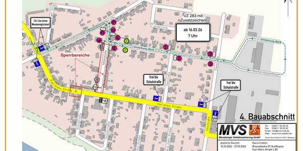seit Oktober 2025 erneuert die MITNETZ Strom in mehreren Bauabschnitten die Stromleitungen im Ort. Im Zeitraum vom 16.03.2026 bis voraussichtlich 27.03.2026 kommt es zu einer Vollsperrung der Karl-Marx-Straße im Bereich der Zufahrt zur ...